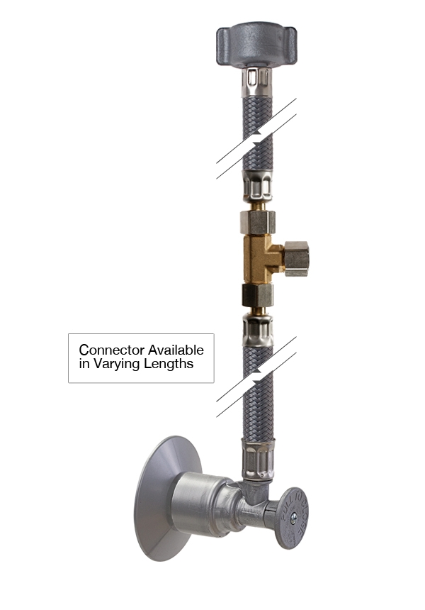 PUSHON® R-SERIES angle stop 1/2" nom. with attached PVC or Braided High Performance connector with inline 3/8" comp. tee x 1/2" reinforced polymer IPS nut with escutcheon.